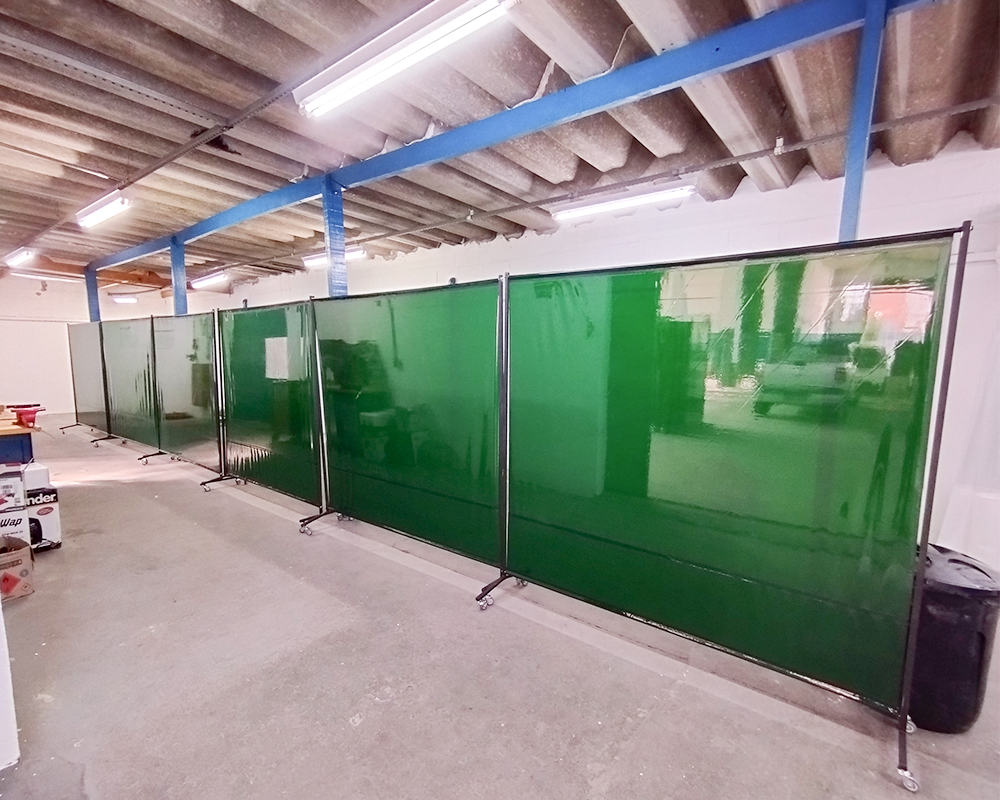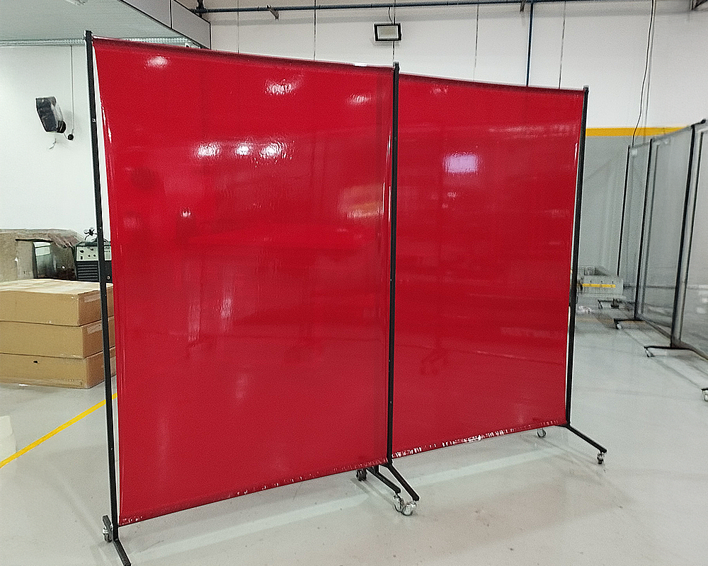 Biombos para solda, fabricados em estrutura metálica com cortina de PVC de alta proteção.